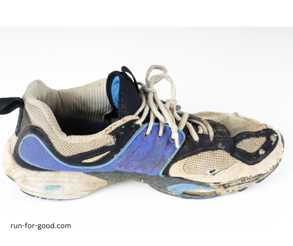worn out running shoes Running shoes that have lost their shape and have holes and worn down treads should be replaced.